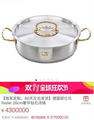 这口钻石锅直径为26厘米,锅身是不锈钢材质,把手由738克的纯黄金打造并镶嵌了13克拉的钻石。属于定制产品,制作周期约为60天,全球限量发行5套。该款钻石锅将由劳斯莱斯送货上门,购买者还可以享受米其林餐厅主厨亲自为买主以及买主10位朋友做一次大餐的庆祝仪式。看到这里,所长脑中只有一个想法,穷