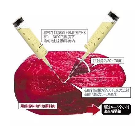 虽然有了价格低一些的非日本产雪花牛肉,但是人们追求低成本替代品的道路并不会到此为止,既然雪花牛肉的美味是肌纤维之间的脂肪带来的,那么直接在肌肉中注射脂肪不就行了吗?