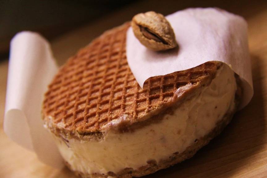 当然,两百多年了,历代吃货也都没闲着。Stroopwafel的吃法早就吃光了传统,吃穿了底线。有这种冰淇淋夹心的焦糖华夫饼: