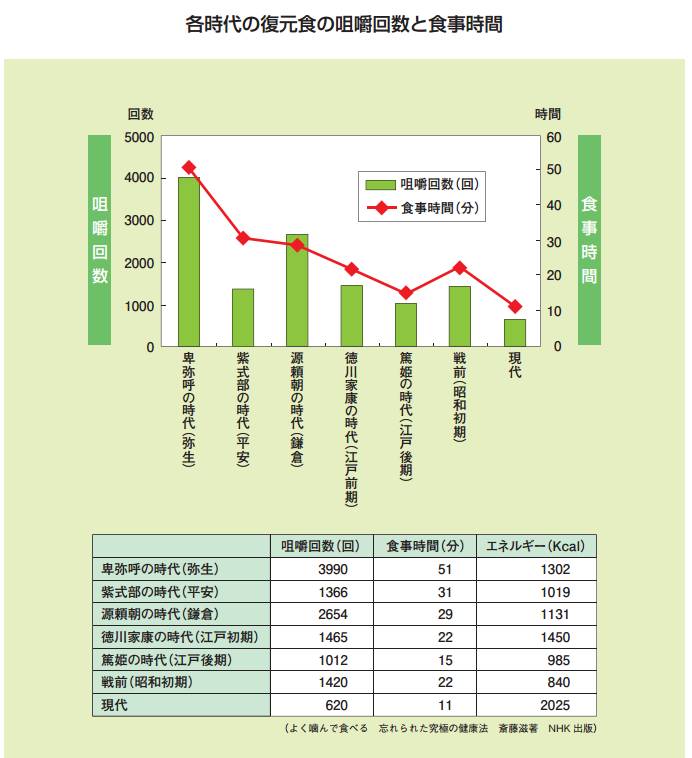 日本古代各时期复原食谱的每顿饭的咀嚼次数和吃饭时间。 图:fukushihoken.metro.tokyo
