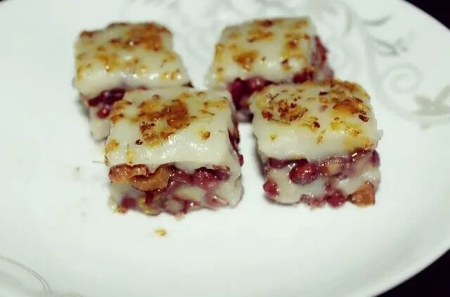 糯米和稻米是本地糕团主力,过年的时候,每每能得到亲戚朋友送的各色米糕。味道以酸甜为主,有些会嵌着瓜子果仁蜜枣,如同英国人的圣诞超级全能大布丁(构成上来说也差不多)。糕点店里日常有售的版本去掉了浓厚的豆沙油脂和繁复干果,类似日本大福,不浇上热腾腾枫糖浆也是治愈力满赛。我自己不怎么吃甜食,但独爱一种微甜的糯米桂花糕,有或者没有浓厚豆沙馅,实登登地一条,凉软弹牙,暗香缭绕,如白玉阶化黄梅雨。