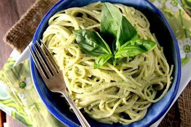 将意面与意面酱拌匀,罗勒撕成小叶,撒在表面。