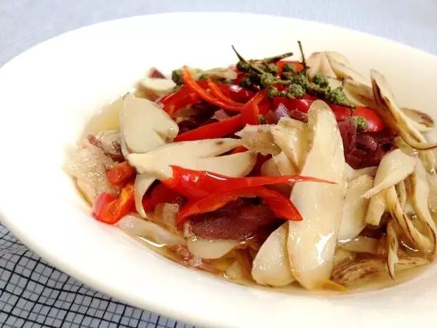 选肥瘦相间的三川火腿切薄薄的片,红辣椒斜切,青花椒用刀拍扁,盖在切好的鸡枞菌面上,不用加其他佐料;