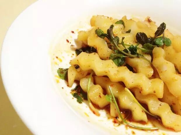 如果有客人点这道菜,后厨会另起一锅清油,低温将初炸过的鸡皮和新鲜的薄荷叶一起炸到鸡皮变脆,同时薄荷保持着绿色且变透明的状态,配上一个干蘸水,这就可以上桌了。吃的时候趁热,鸡皮酥脆香,薄荷也是酥脆香。饭毕出门,若是觉得炸过的薄荷吃着不过瘾,绕过三和酒店,大石桥旁边有家卖凉米线和炸洋芋的,点一碟炸洋芋,里头软软的薄荷叶不下锅,只靠土豆条的热度来传递香气,是裹了蘸水也还能吃出清凉的火候。不过这都是十几年前的场景了,如今的丽江古城,不知道还有没有这样一家小菜馆呢?