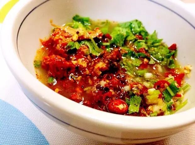 海稍鱼的灵魂还在于那碗特别讲究的蘸水,那才是店家真正的秘方。鱼起锅上桌之后,店家的小工会出来忙别的,厨房里的主厨则开始炒蘸水,配料大概有火焙辣椒面、盐、味精、花椒、胡椒、蒜粒、小葱、姜、芫荽、芝麻、苏子等等十余种。锅加热倒入菜籽油,然后倒入蒜泥文火慢炒至发黄,加入辣椒面炒一分钟再加入芝麻和苏子炒至焦黄起锅,加盐、味精、胡椒、芫荽、小葱,迅速端到客人桌上,嘱咐你浇上一勺鱼汤,刺啦一声,瞬间香气四溢。