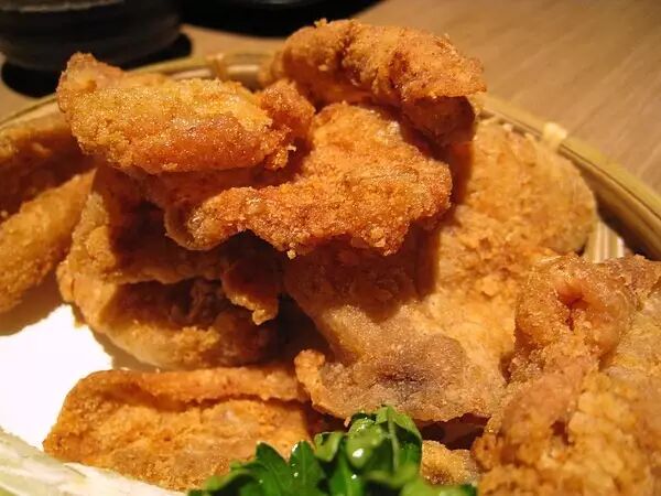 友谊小吃家的菜,我最钟爱的有一道薄荷炸鸡皮,此菜与烩煳辣鱼、卤无骨凤爪并列店里最受欢迎的三个菜,去得晚了肯定没有口福。这道菜选用白肉鸡的鸡皮,剔除油脂洗干净,切成大约两指长宽,用盐、草果粉和胡椒腌入味,再以清水洗净滤干水之后,用牙签穿起来挂薄糊,入油锅炸定型。完成了这一道工序,才能成为玻璃柜台里放着的食材,底下垫着新鲜的薄荷叶,勾着你的味蕾。