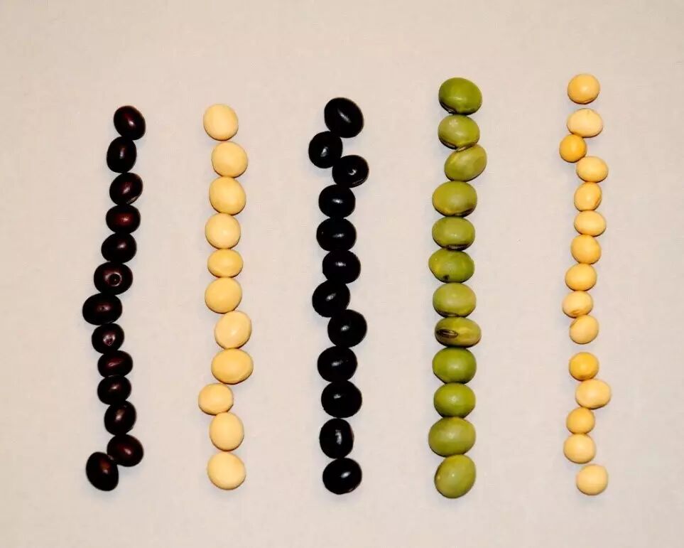 现在我们就能解释为什么“毛豆是黄豆小时候”这种说法不准确了。我们吃的毛豆都是在果实和种子没有完全成熟时就摘下来出售,所以不管哪个品种的毛豆都是绿油油的。人们在选育毛豆品种时,一般并不会特地把成熟后的种皮颜色作为目的性状,所以如果让不同品种的毛豆发育成熟,它们的种皮颜色可能是黄色,也有可能是绿色、黑色等其他颜色。