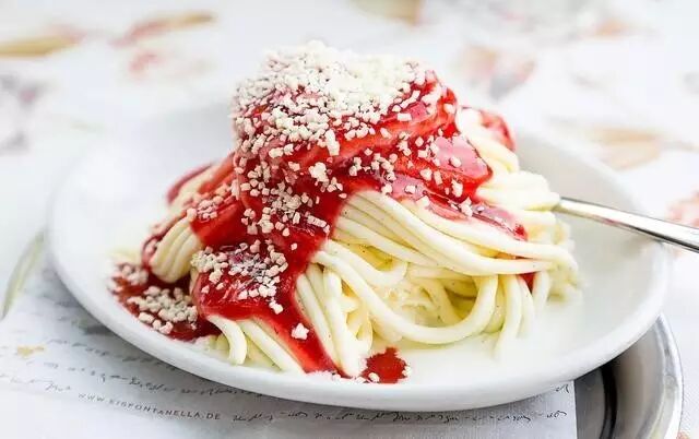 德国慕尼黑有一家叫做撒切莱蒂(Sarceletti)的冰淇淋小作坊。这家人的先祖从1879年就来到德国专业做冰淇淋。他们在1960年代开发出一款风靡南德的冰淇淋意面(Spaghettieis):把冰淇淋放在压意面模子里压制成面条一样的冰淇淋条。随后撒上草莓酱、糖霜和椰子粉,假装是意面中常用的番茄酱。冰淇淋吃起来毕竟不像真的意面根根分明,会粘在一起;而酸爽的草莓酱增加了丰富的口感,是必不可少的配料。