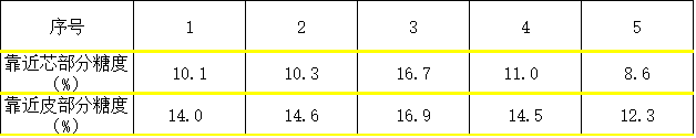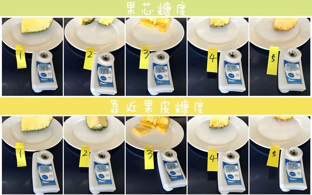 菠萝和西瓜正好相反,靠近皮的疏松组织糖度高,结构紧致的菠萝芯味道会比较寡淡,为了对菠萝的糖度有个全面评估,我们利用糖度计分别测量了靠近皮部分和靠近芯部分的果肉糖度。
