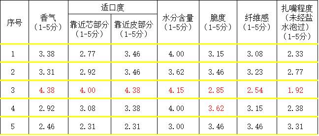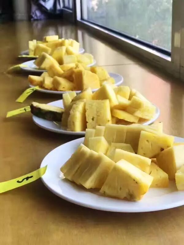 上面都是仪器测出来的冰冷数据,到底菠萝们好不好吃,吃吃才知道~我们从公司内部随机找来了15名试吃员,分别试吃五种样品,然后从口感、脆度、纤维度等方面进行打分,最后按照自己的喜好程度将五种菠萝排个名次。