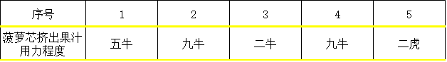 根据挤菠萝汁小哥哥的描述,我们将菠萝芯能被挤出果汁的用力程度也做了张表: