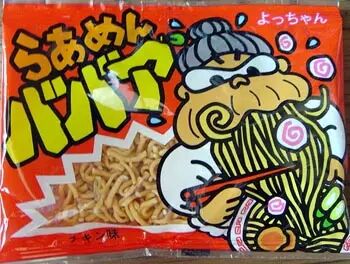 北鼻星星拉面(ベビースターラーメン)还有拉面容嬷嬷(らあめんババア)华丽版干脆面的渣儿,是的就是那个。如果里面还有玩具,那就完美了!北鼻星星看到这位嬷嬷不会被吓死么…