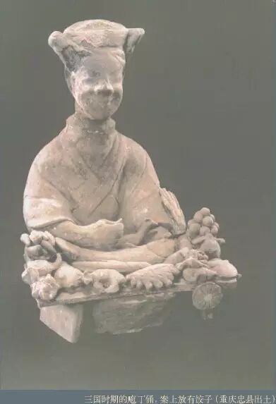 在地处长江三峡的重庆忠县的三国时期墓群中,也有重要发现。其中的庖厨俑,是难得一见的那个时代陶塑作品,具有很高的艺术价值,也是古代饮食文化研究的重要资料。庖厨俑陶塑表现古代厨师正在厨案边劳作,我们见到厨案上摆放了食料,有猪羊鸡鱼,也有一些果蔬等,都应是当时富贵人家的常食之物。仔细看去,厨案上的中心位置还摆着捏好的饺子!饺子为半月形,馅料饱满,接口捏花边样,是很认真的制作。