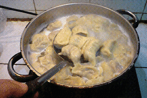大概在饺子浮上来之后有方法要加凉水。有人用加几次凉水来控制时间,这个不用说太粗略了。有人说是防止暴沸,这也不大说得通,否则就不存在大火煮皮小火煮馅的说法了。