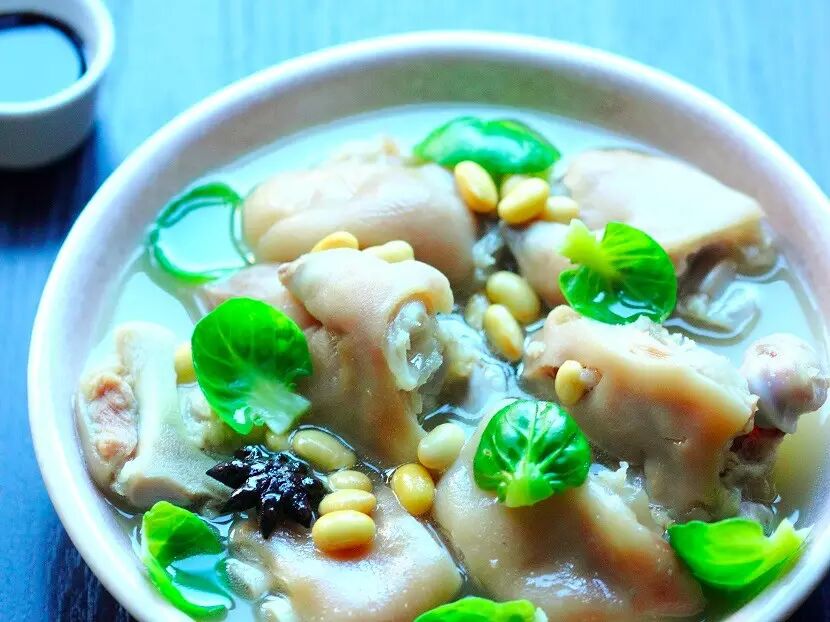 同时豆类,蹄花中的豆作用不像黄豆猪脚煲里的黄豆。黄豆吸了猪脚的油腻,使后者的口感清爽不少,在气味上也起了烘托作用。煲猪脚,配菜的气味很重要。粤菜中的猪脚姜需先用甜醋将姜煲入味,再加去过血水的猪脚、鲜鸡蛋、冰糖煲上两个钟头。煲猪脚往往不需要一次吃完,所以试一试蔡澜提过的繁琐做法也值得:将猪脚扔进一镬滚油炸一炸,备一桶冰多水少的冰水,炸好的猪脚出锅即刻放入冰水中,淬火似的,猪皮被收紧,再入煲时才化开,劲道弹牙。