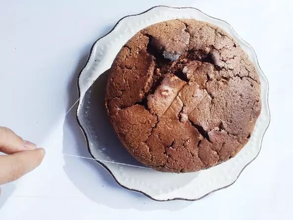 1.蛋糕冷却后均分为三片(如图,手残星人表示,使用一根细线就可轻松分层)