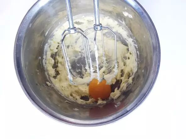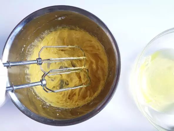 2.分次加入蛋黄,每次加入后打蛋器转速调至最大,使黄油与蛋黄乳化完全后再加入下一个蛋黄