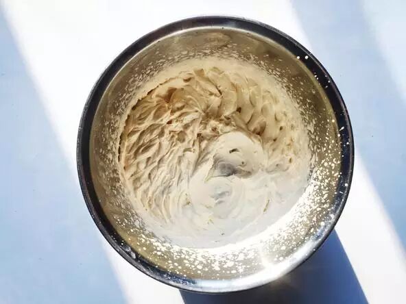 三者混合均匀,打蛋器打发至出现纹路,缓缓-不流动状态。