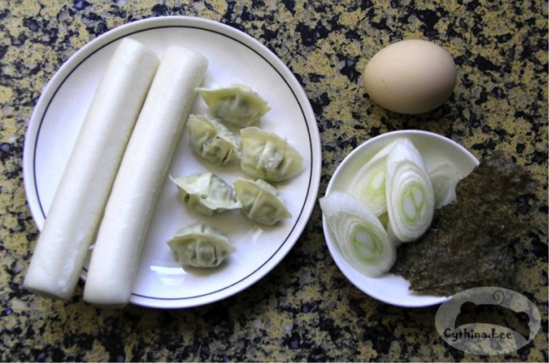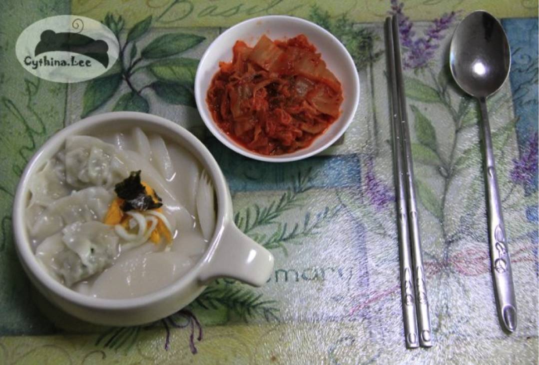 切片的年糕和饺子在汤头中煮熟,装饰上蛋皮和海苔碎,搭配辣白菜就是一顿完整的韩式早餐了