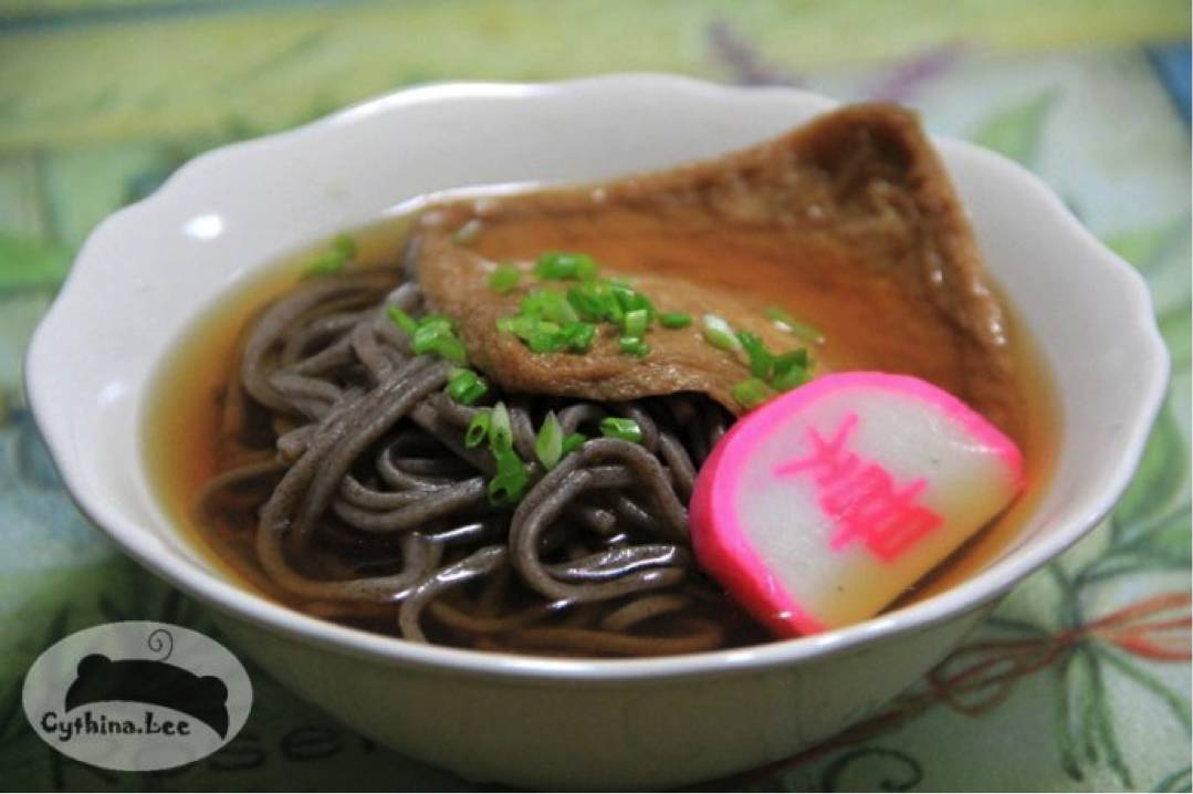 通常新年期间,主妇们会提前准备好一壶出汁放在冰箱,要用的时候一热就可以了,方便得很也符合不扰灶神的初衷。烧水将荞麦面煮熟、鱼板烫熟,将面盛碗中摆一块油豆腐、一块鱼板,淋上热的柴鱼高汤,再撒一点葱花或海苔丝就完成了