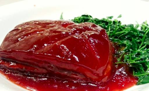 2、针对块形较大的红烧肉,为了保持形状的完整,会将肉取出装盘,然后原汁打芡淋上,比较有代表性的是樱桃肉、酱方、腐乳肉等等。