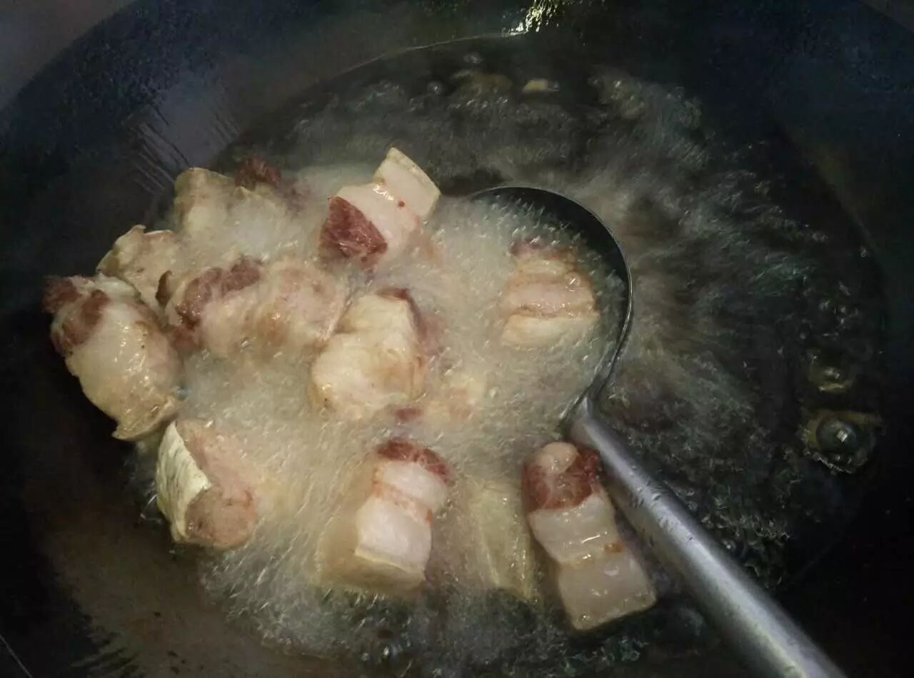 油炸是在煸炒的方法上,为了适应大批量的制作而改进的方式,可以快速的让肉去掉一部分的油脂并且定型。缺点就是瘦肉部分的口感比较硬,这也是现在很多酒店红烧肉瘦肉部分发硬的一个很重要的原因。