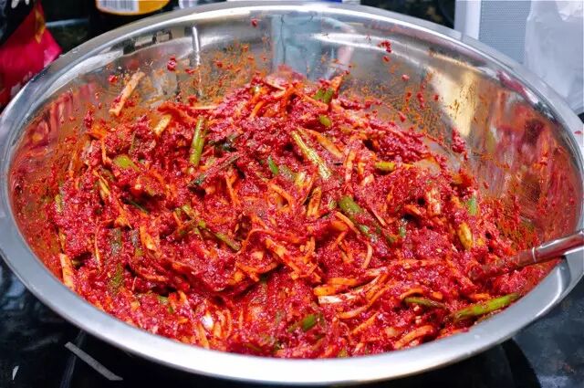 糯米粉加水(用高汤更好)煮成稀糊。大蒜、生姜捣碎。青萝卜切丝,白梨、苹果切丁(我喜欢切片,腌过的苹果片和白梨片味道很特别,比辣白菜好吃,一抢就光),干辣椒粉、白糖、白醋、食盐、味精、鱼露、咸虾酱,通通倒进糯米糊里,加些水慢慢搅匀,最后放进韭菜、芹菜和葱段,调成辣酱。至于用量,深藏在东北妇孺皆知的顺口溜里:一斤辣椒一两姜,二两精盐三两糖,味精鱼露不可少,三两蒜泥配成方。恩,不过其实,蒜可以多放些。