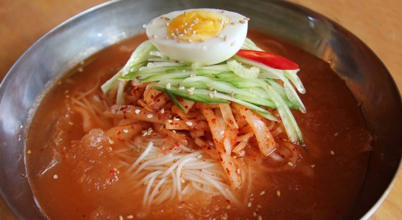 冷面是朝鲜族特色食品,夏季食用,用荞麦面或玉米面轧制而成,传统的做法还会把榆树皮晒干磨成面,掺混进去,据说加了榆树皮面更劲道。面条煮熟入冷水降温,用鸡汤或牛肉汤,佐以牛肉片、半个白煮蛋、辣白菜、黄瓜丝、苹果片、白梨片、番茄,加白醋、食盐、白糖、辣椒面,最后撒上白芝麻,挖勺朝鲜辣酱,口味有酸甜和酸辣两种。
