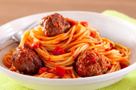 4.把肉丸叉入酱汁里,确保每一面都裹到了西红柿汁。把平底锅盖上,小火煮30分钟。可以不时的往肉丸上浇淋西红柿汁或者加点水,以防料理太干。煮15分钟左右,可以开始准备煮意面了。30分钟后将剩下的欧芹中的大部分捣碎倒入酱汁里,再一次淋浇肉丸,再把肉丸和酱汁浇在意面上。最后将还余下的欧芹和帕尔马干酪洒在意面上。