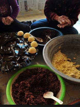 泡了一夜的红小豆或红芸豆扔进大锅里,放白糖一块煮。豆子烀 (hū) 熟不破皮,捣烂,这个过程是不断火的,所以一定要看着火,火大会干会糊,火小太稀,程度求一个刚刚好,需要耐心和经验。豆馅做好,捏成一个个蛋黄大小的团儿放在室外冻一夜。据过来人讲,50斤米配12斤红芸豆,能包近100斤粘豆包,1000多个。