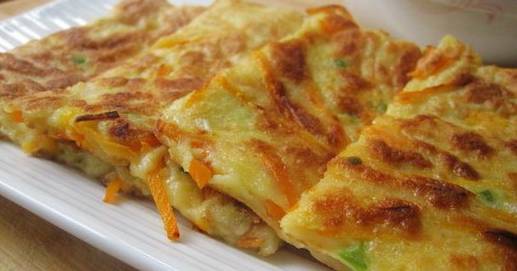 胡萝卜擦细丝,加中筋粉、鸡蛋和水做成面糊,冷藏过夜。晨起开火煎饼,煎饼出锅后按9做法煮酸辣豆腐汤。