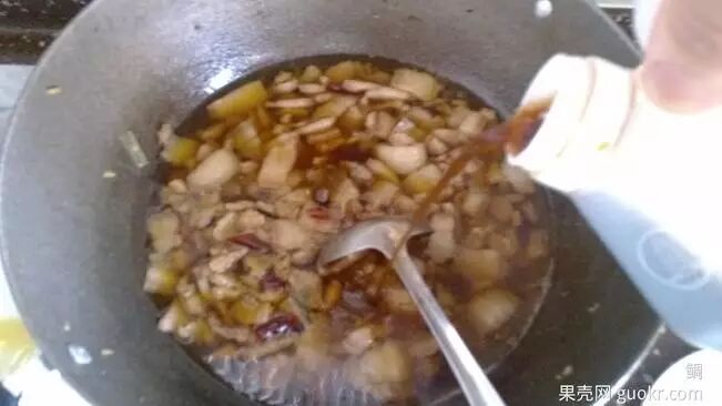 小火炒,逐步加姜丝、干辣椒、葱段,接下来分时段逐次加入备用的熟食用油,至肥肉丁呈半透明状,加入较大量盐,翻炒至肥肉丁透明度更进一步,加入较大量醋(普遍市场有的是山西陈醋,有条件的加正宗岐山醋,本次添加1斤左右)翻匀,中小火烹煮;