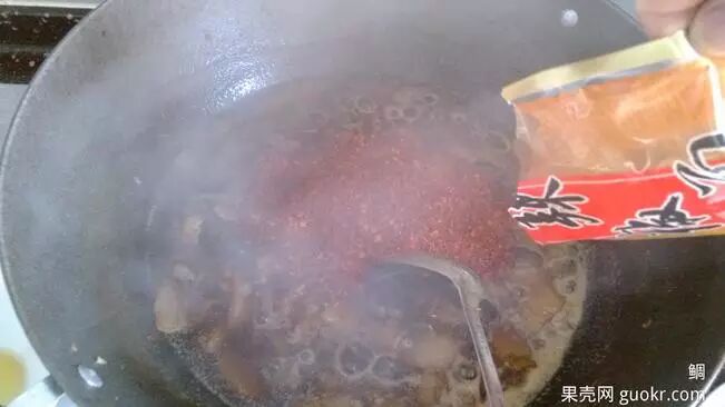 烹至锅中总量接近加醋前物质总量时,加入少了调料面儿,翻几下后加入辣椒面儿,本次加入100克,翻7下,关火。