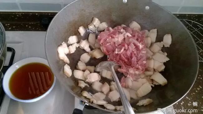 热锅倒入切好的肥肉丁翻炒,至略有油析出加入瘦肉丁共同翻炒;