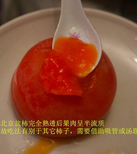 来到北方以后,吃到另外的一种软柿子是房山韩村河的冻柿子,属于磨盘柿,个头很大口感像冰激凌,很好吃。做法也简单,就是成熟的柿子摘下后在通风的地方软化去涩,然后在寒冷的冬天冻住,吃的时候回温或者放入凉水浸泡变软,然后取出直接用勺子吃,真的很像冰激凌。这样冻起来的柿子放入冰柜甚至可以存放到来年五六月份,气候有些炎热的时候拿出来吃更美。