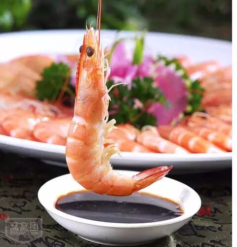 将河虾用白酒炝醉以后,蘸调料食用。
