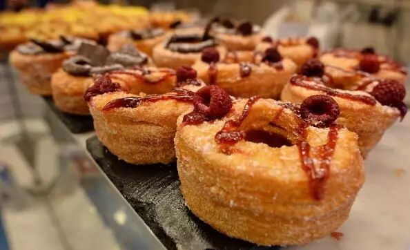 大胆(码)的美国人并不满足于此,纽约市的一家面包店在2013年6月推出了可颂和甜甜圈的结合体——可颂甜甜圈!这些甜甜圈中有奶油夹心,吃起来口感像羊角包一样层层叠叠,再加上最外层的糖粉和糖霜,简直让人无法拒绝(¯﹃¯)