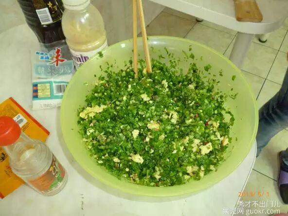扯远了,图上为准备材料,把韭菜摘洗干净,切成碎末。