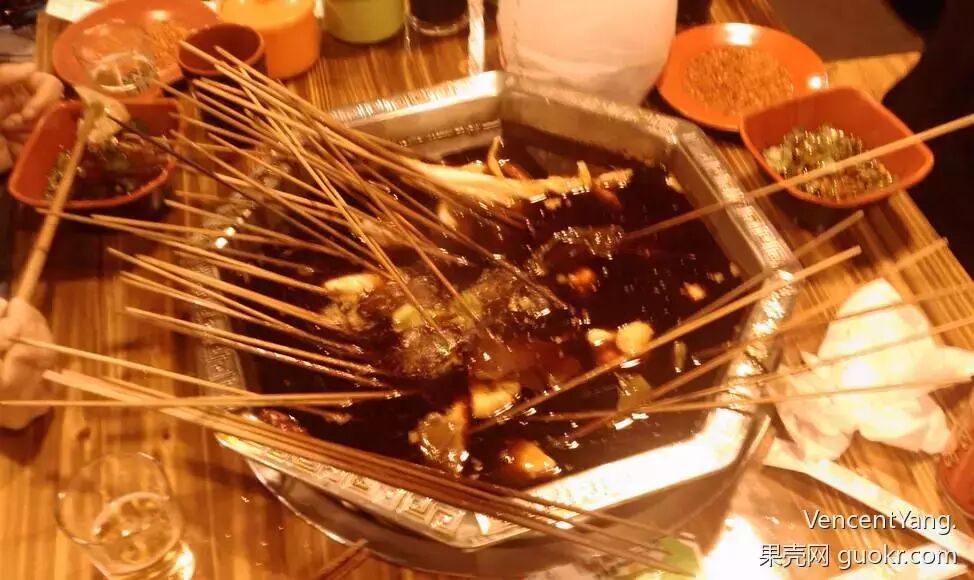 当然也有穿在竹签上上桌的,但是由于桌上没有锅,所以是放置在一个装了汤料的容器里的。食客才食用的时候一次取食多串,并将上面的食材全部捋到自己的碗里食用。