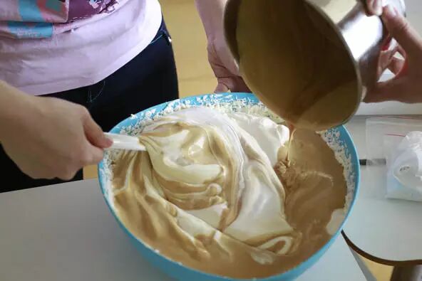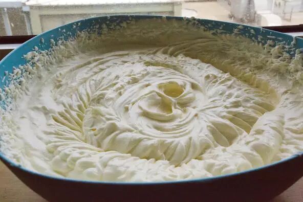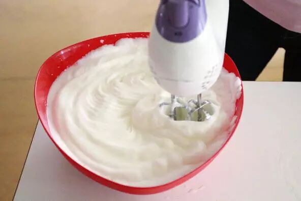 隔着热水打发,打到体积增大两倍左右,再放入冰箱。