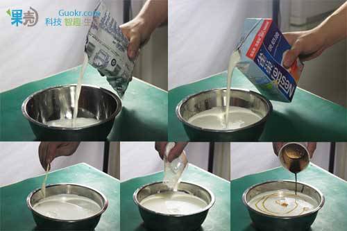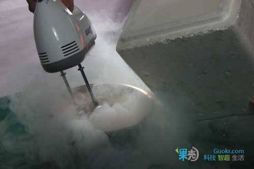 下面就是激动人心的时刻了:有请液氮登场!这时你将非常需要一个“帮手”!你们一个负责平缓、点断式的倒入液氮,一个负责努力地搅拌原料。