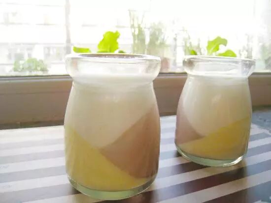 免考布丁or奶冻:这些甜点也完全可以用电饭锅搞定。比如这个三色奶冻,其实我也不知道它该叫什么。底层黄色的是鸡蛋液和牛奶以1:2调匀后蒸熟 的,杯子稍微倾斜就可以呈现出这样的坡度,中间层是可可粉+牛奶+鱼胶粉(加热至鱼胶粉完全溶解即可。之后放入冰箱待其凝固,只要稍微倾斜又可出现这一坡 度。可可粉溶解度很低很低,最后很多沉底,用巧克力效果会好很多),最上层是牛奶+鱼胶粉(加热溶解后倒入之前已经凝固好两层奶冻的牛奶瓶里)。