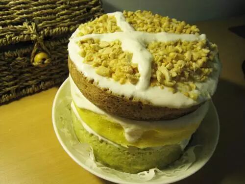 这个是可可+原味+抹茶蛋糕。中间抹上酸奶蜜豆花生椰丝。