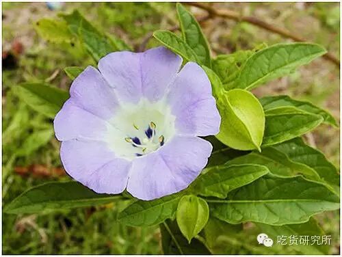 冰粉虽然甜品店里没有,但在四川、云南等西南省份的街头可是很常见的清凉小吃。让冰粉能够凝固成冻的主要是果胶(高等植物细胞壁的主要成分之一),而提供这些果胶的就是茄科的假酸浆(Nicandra physaloides)。假酸浆是很常见的一种野草,最大特点就是浅蓝色带紫斑的钟形花,以及膨大成小灯笼一样的萼片。制作冰粉时将假酸浆的种子用水浸泡,取浸出液加入石灰水等,静置一会儿就会凝固,再加上红糖水就可以上街出售了。