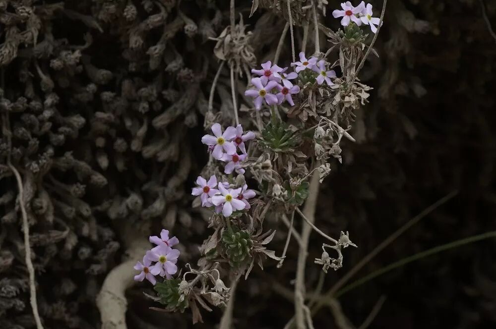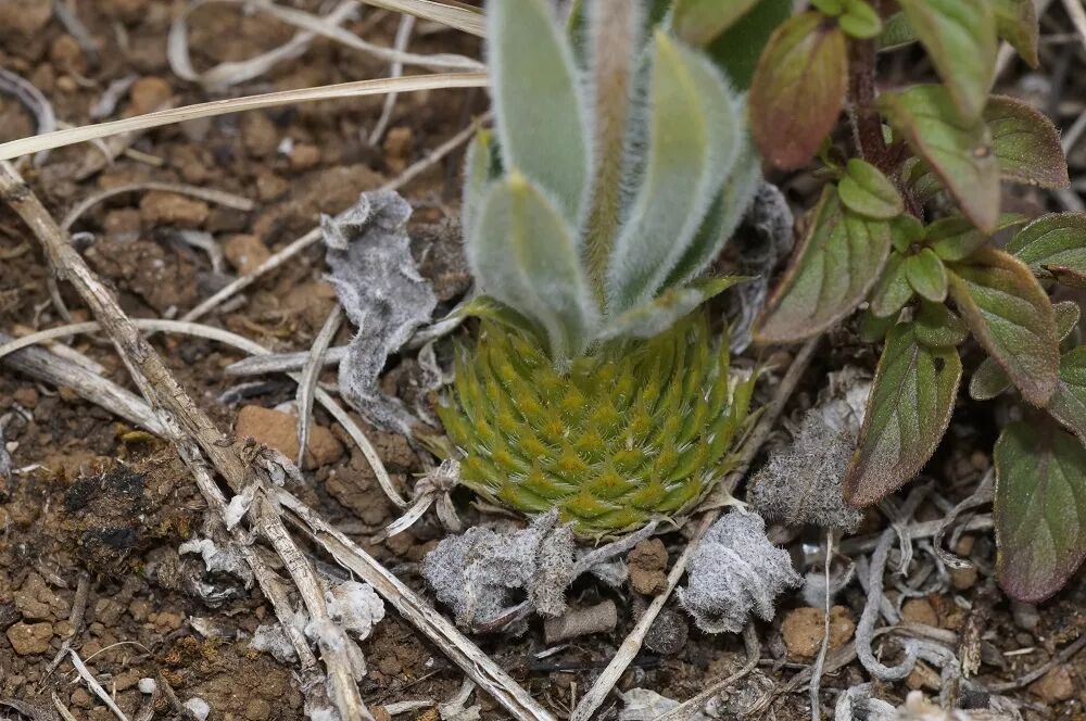 高原地区的气候环境生存艰辛,点地梅们努力降低了露出地表的高度,把所有的枝叶都紧紧地挤在一起,既躲避了高原上的大风,又减少了热量和水分散失。仔细看“垫子”的表面,好像是由许多小颗粒组成的,每粒都是一个叶丛,对应着一根枝条。在高度不超过两厘米的植株下面,是无数密集的老枝,往往还带着历年的枯叶。