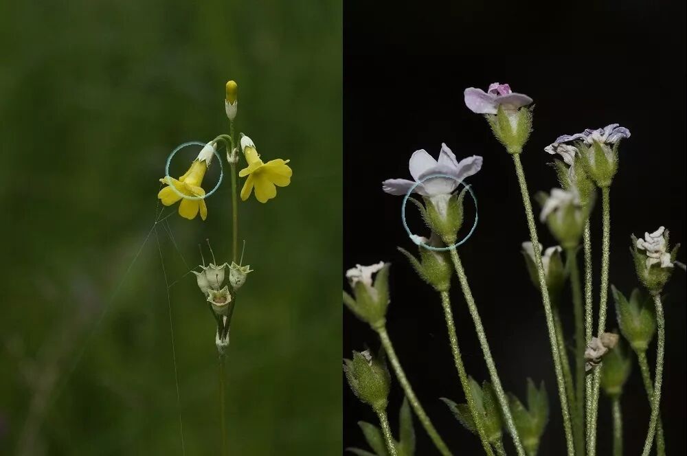 亚东灯台报春(P. smithiana)(左)和高葶点地梅(右)花朵的对比,从侧面可见,报春属的花冠管长于花萼,而点地梅属的花冠管短于花萼。图片:含笑