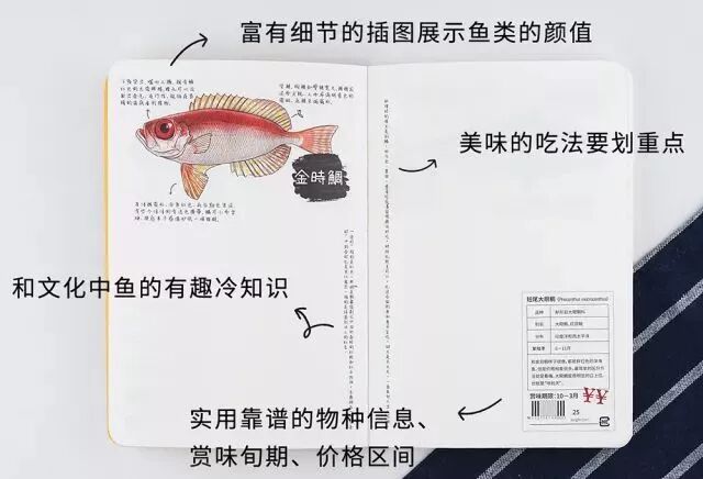 本子右下角像标签一样,把鱼的赏味期限、繁殖季、尺寸、分布、食用的注意事项等知识汇集在一起,没有长篇大论,信息简洁又明确。