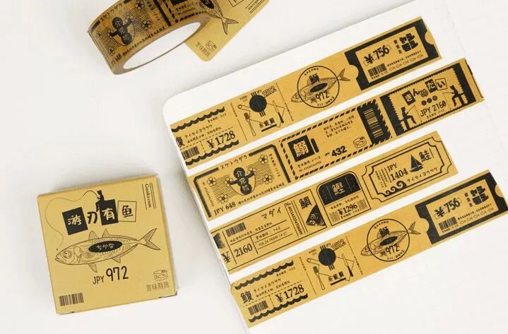 不仅买本子送3张贴纸,同系列“游刃有鱼”还出了两款胶带,一种是各种鱼保鲜出售的样子,非常有逛鱼市场的feel。