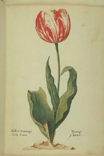 此外,他还首次发现并记录了一些拥有独特花纹的郁金香。这些郁金香的花瓣上出现了极富艺术性的突变花纹,而花纹的成因正是后来大名鼎鼎的郁金香碎色病毒(Tulip breaking virius)。彼时的科学研究水平,并不足以找出这种现象背后真正的原因,但人们似乎也并不在意,毕竟这些迷人的花纹足以让人为之疯狂了。