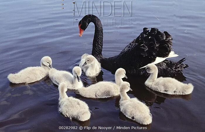 黑天鹅雏鸟为早成雏,即雏鸟一出壳,全身就被有绒羽,离巢之后可以运动,具有较好的体温调节和觅食能力。雏鸟出壳之后会紧紧跟着亲鸟,亲鸟则习惯一前一后将雏鸟置于中间,保证雏鸟的安全。